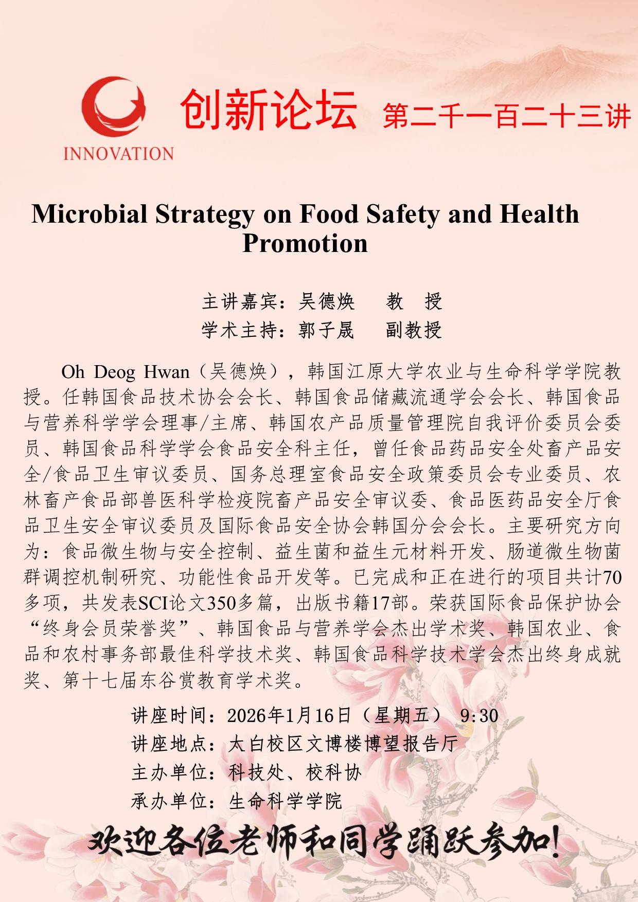 吴德焕 教授 15vip太阳集团官网创新论坛第二千一百二十三讲:Microbial Strategy on Food Safety and Health Promotion 讲座时间 2026年1月16日(星期五)9:30 讲座地点 太白校区文博楼博望报告厅 讲座人介绍 吴德焕 教授 讲座内容