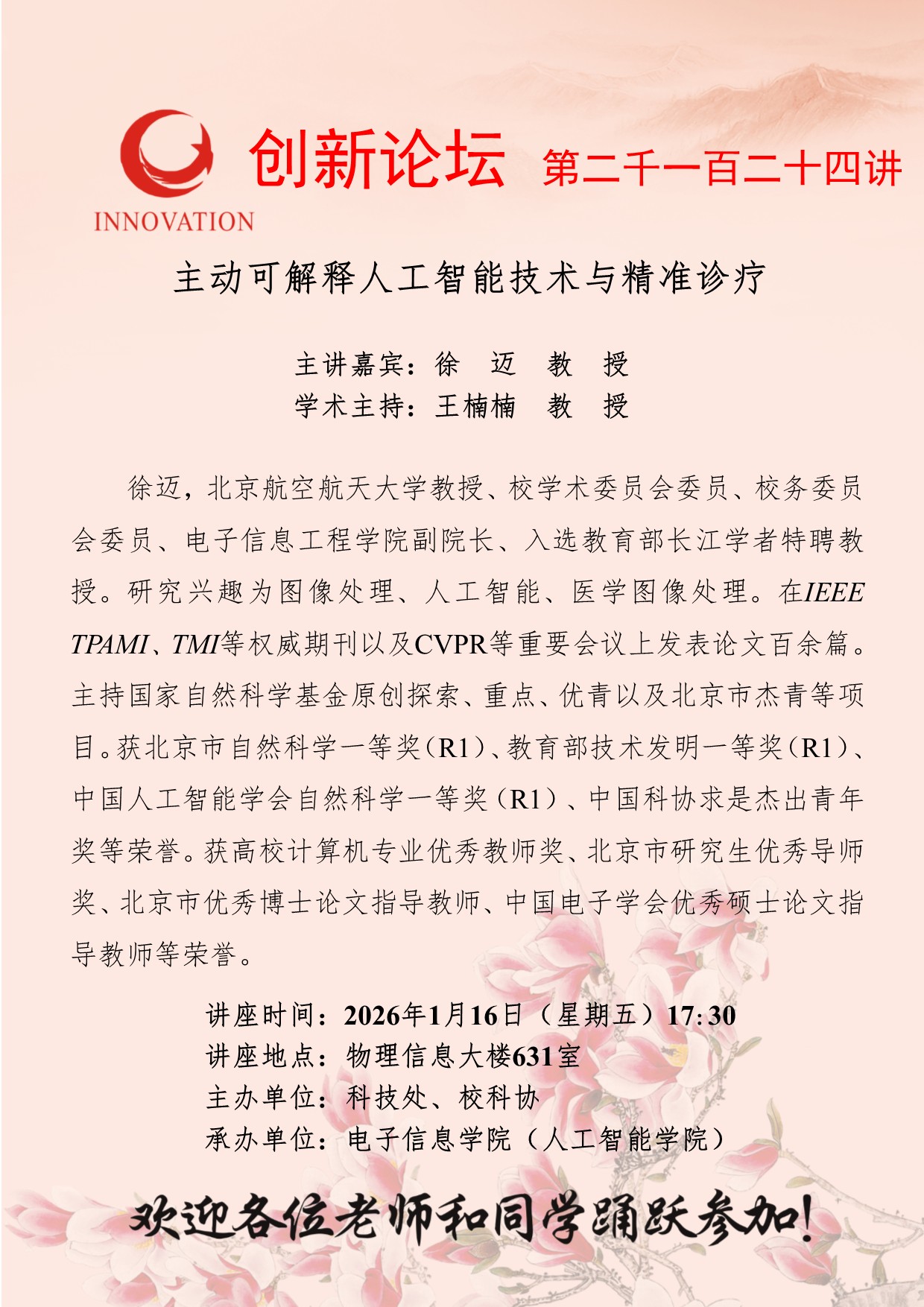 徐迈 教授 15vip太阳集团官网创新论坛第二千一百二十四讲:主动可解释人工智能技术与精准诊疗 讲座时间 2026年1月16日(星期五)17:30 讲座地点 物理信息大楼631室 讲座人介绍 徐迈 教授 讲座内容