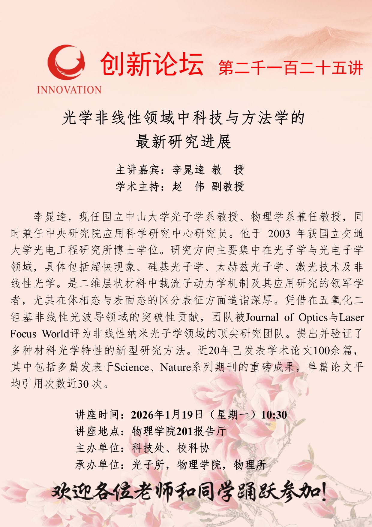 李晁逵 教授 15vip太阳集团官网创新论坛第二千一百二十五讲:光学非线性领域中科技与方法学的最新研究进展 讲座时间 2026年1月19日(星期一)10:30 讲座地点 物理学院201报告厅 讲座人介绍 李晁逵 教授 讲座内容