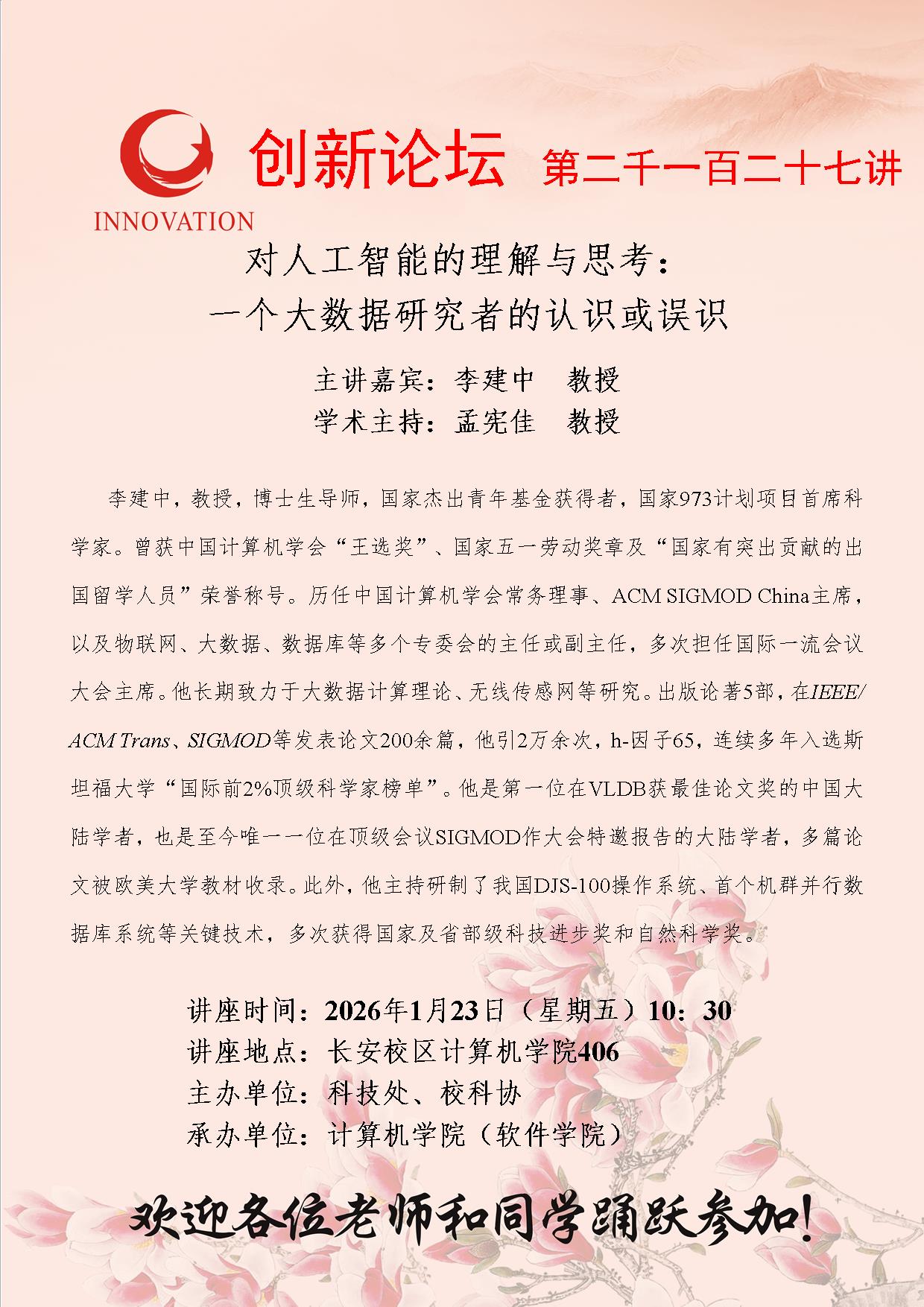 李建中 教授 15vip太阳集团官网创新论坛第二千一百二十七讲:对人工智能的理解与思考:一个大数据研究者的认识或误识 讲座时间 2026年1月23日(星期五)10:30 讲座地点 长安校区计算机学院406 讲座人介绍 李建中 教授 讲座内容