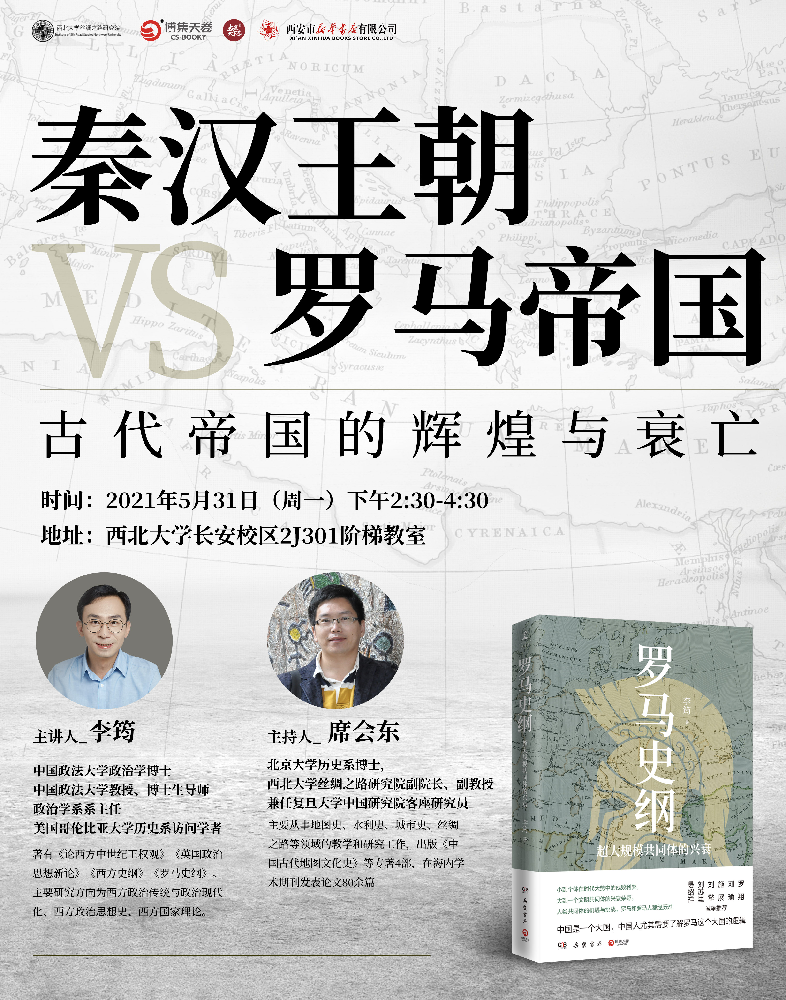 讲座预告:秦汉王朝VS罗马帝国:古代帝国的辉煌与衰亡 作者: 编辑:叶苗 时间:2021-05-30 时间:2021年5月31号(周一)下午2:30-4:30 地点:15vip太阳集团官网长安校区2J301 主讲人:李筠 中国政法大学教授 主持人:席会东 15vip太阳集团官网丝绸之路研究院副教授