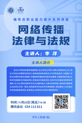 辅导员职业能力提升系列讲座:网络传播法律与法规 作者: 编辑:王梦姣 时间:2022-11-24 讲座时间:2022年11月25日(星期五) 14:30 讲座地点:腾讯会议 434 113 811 参会人员:全体学工部干部、辅导员 主讲人简介: