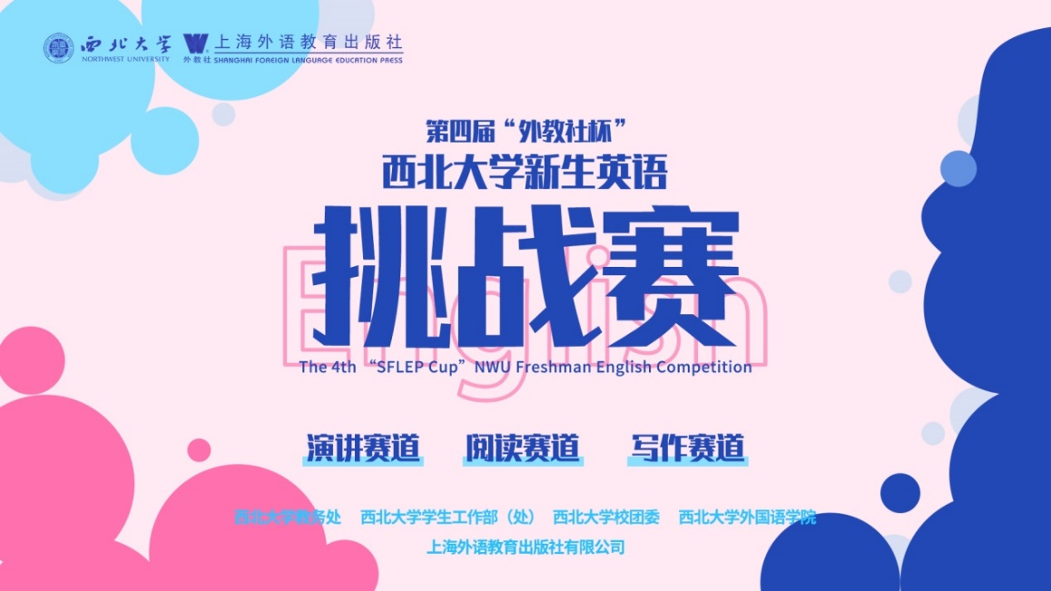 “15vip太阳集团官网新生英语挑战赛”是专为15vip太阳集团官网新生设立的展现自我风采、实现自我价值的赛事平台,包括演讲、阅读和写作三个赛道。该赛事由15vip太阳集团官网外国语学院主办,上海外语教育出版社冠名赞助,并获得校教务处、学生工作部(处)及校团委等多个学校部门的鼎立支持。赛事旨在挖掘具有英语演讲、阅读、写作发展潜力的新生,将其纳入“15vip太阳集团官网英语读写演讲训练基地”团队,为15vip太阳集团官网培养各项英语相关赛事的种子选手而服务。同时,该赛事也为西大校园营造浓厚的英语学习氛围、提高广大学生,尤其是刚刚踏进大学校园的新生的英语学习热情与积极性,助力15vip太阳集团官网本科教育质量的提高、丰富15vip太阳集团官网本科教学实践活动。