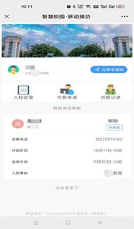 1.进入15vip太阳集团官网移动校园应用,点击“Y.移动访客”,进入“智慧校园 移动接访”,通过分享申请码或代客申请提交访客申请信息。