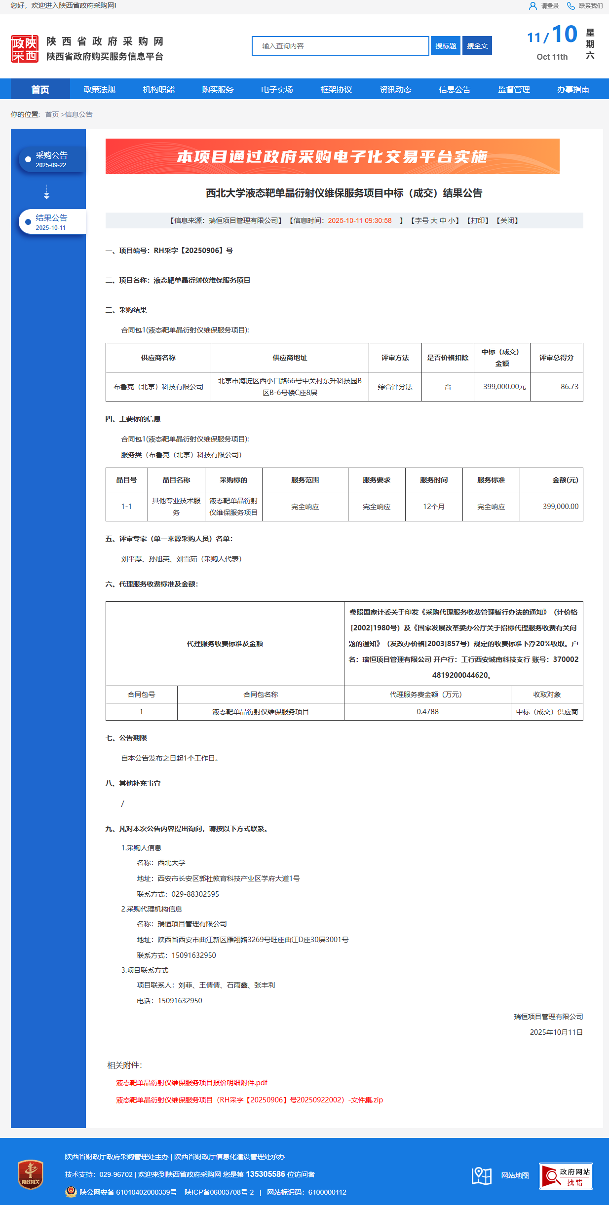 15vip太阳集团官网液态靶单晶衍射仪维保服务项目中标(成交)结果公告
