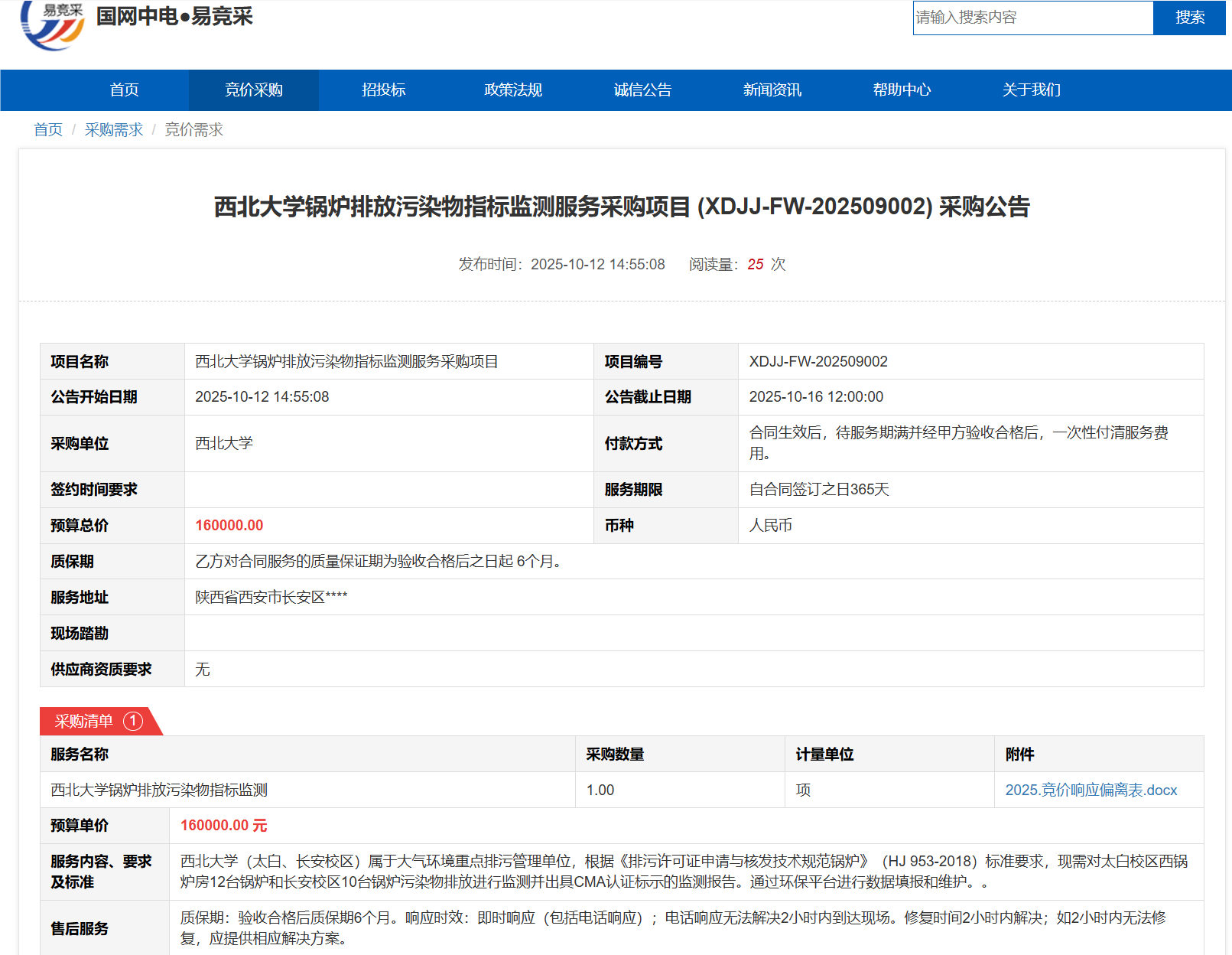 15vip太阳集团官网锅炉排放污染物指标监测服务采购项目(XDJJ-FW-202509002)竞价采购公告
