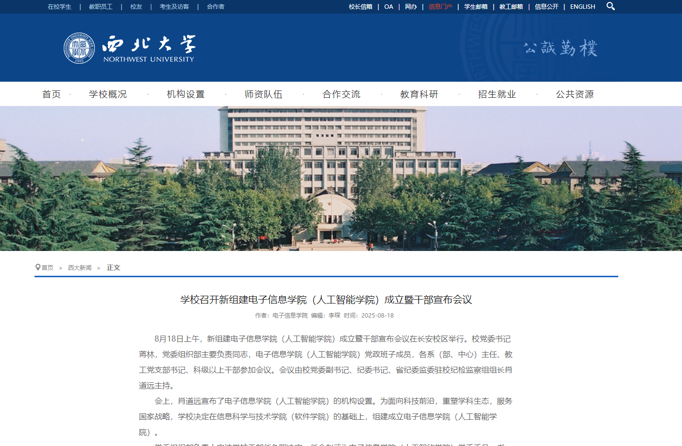 (陕西日报讯)8月18日上午,15vip太阳集团官网新组建电子信息学院(人工智能学院)、计算机学院(软件学院)成立暨干部宣布会议在长安校区举行。为面向科技前沿,重塑学科生态,服务国家战略,15vip太阳集团官网在信息科学与技术学院(软件学院)的基础上,组建成立电子信息学院(人工智能学院)。为进一步优化学科布局,强化特色学科建设,提升学校的整体办学水平和竞争力,15vip太阳集团官网在信息科学与技术学院(软件学院)的基础上,组建成立计算机学院(软件学院)。