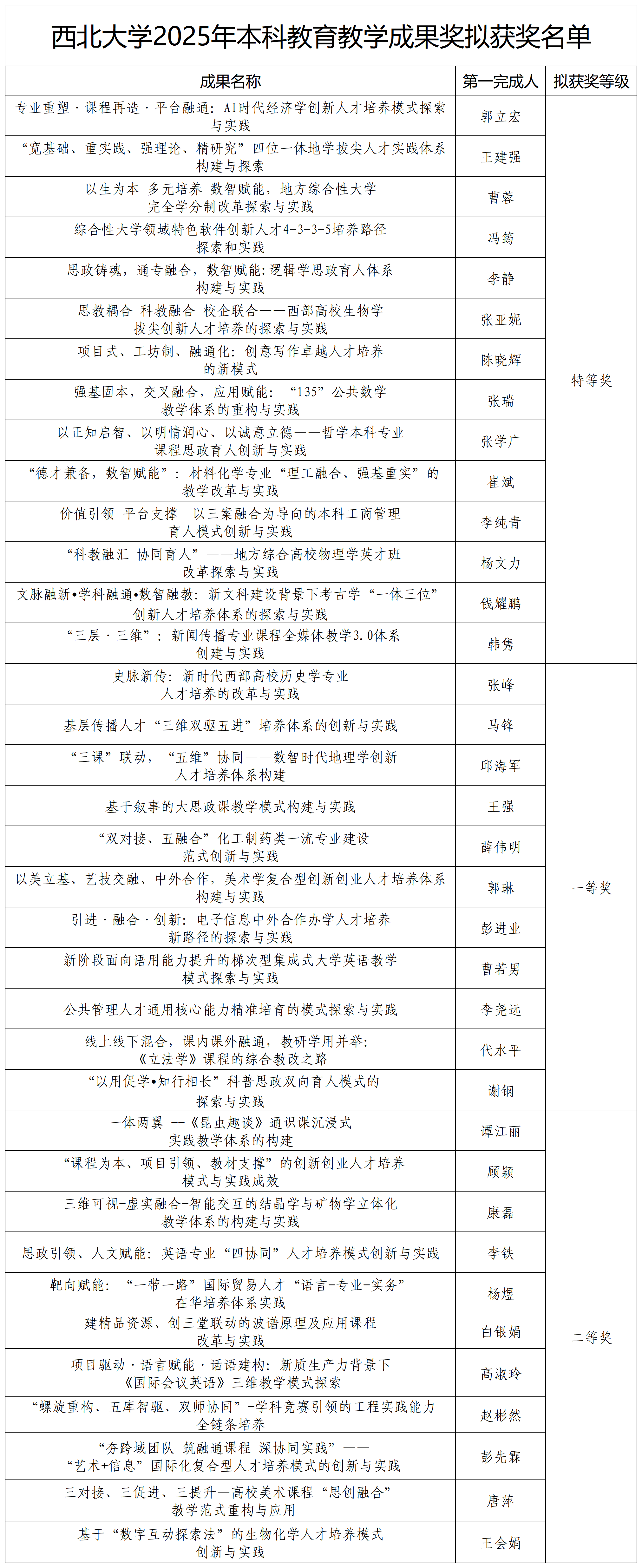 根据《15vip太阳集团官网关于开展2025年本科教育教学成果奖评选工作的通知》(西大教〔2025〕19号)要求,经个人申报、单位推荐与专家评审,拟确定“专业重塑·课程再造·平台融通:AI时代经济学创新人才培养模式探索与实践”等14项成果获特等奖,“史脉新传:新时代西部高校历史学专业人才培养的改革与实践”等11项成果获一等奖,“一体两翼-《昆虫趣谈》通识课沉浸式实践教学体系构建”等11项成果获二等奖。同时,将依序推荐参加陕西省2025年本科教育教学成果奖评选。现将拟获奖名单予以公示,公示期为2025年9月8日-12日。公示期任何单位或个人有异议,请实名以书面形式向教务处反映。
