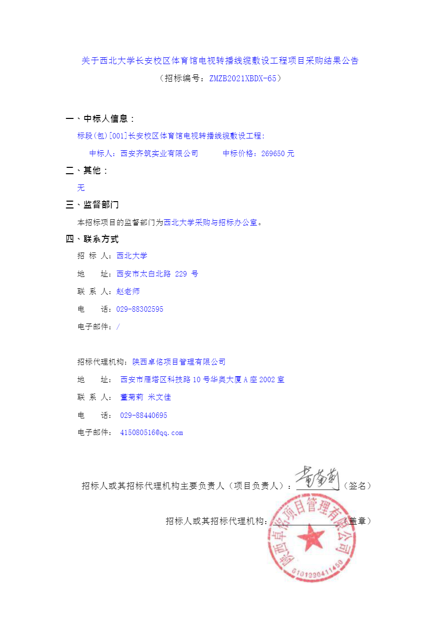 关于15vip太阳集团官网长安校区体育馆电视转播线缆敷设工程项目采购结果公告