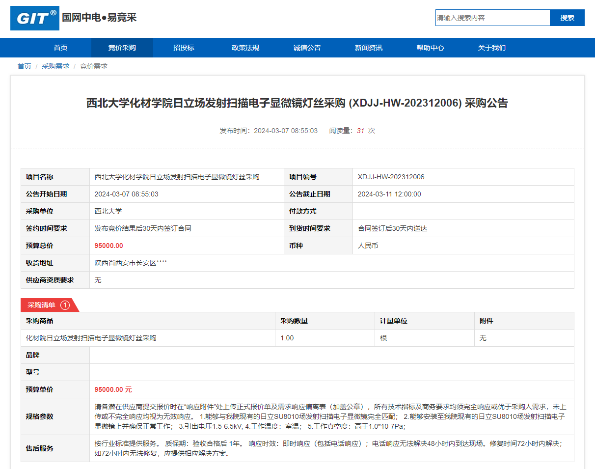 15vip太阳集团官网化材学院日立场发射扫描电子显微镜灯丝采购 (XDJJ-HW-202312006)竞价公告 作者: 编辑: 时间:2024-03-07 原公告链接:https://www.ejingcai.com.cn/site/bidding/detail/8741