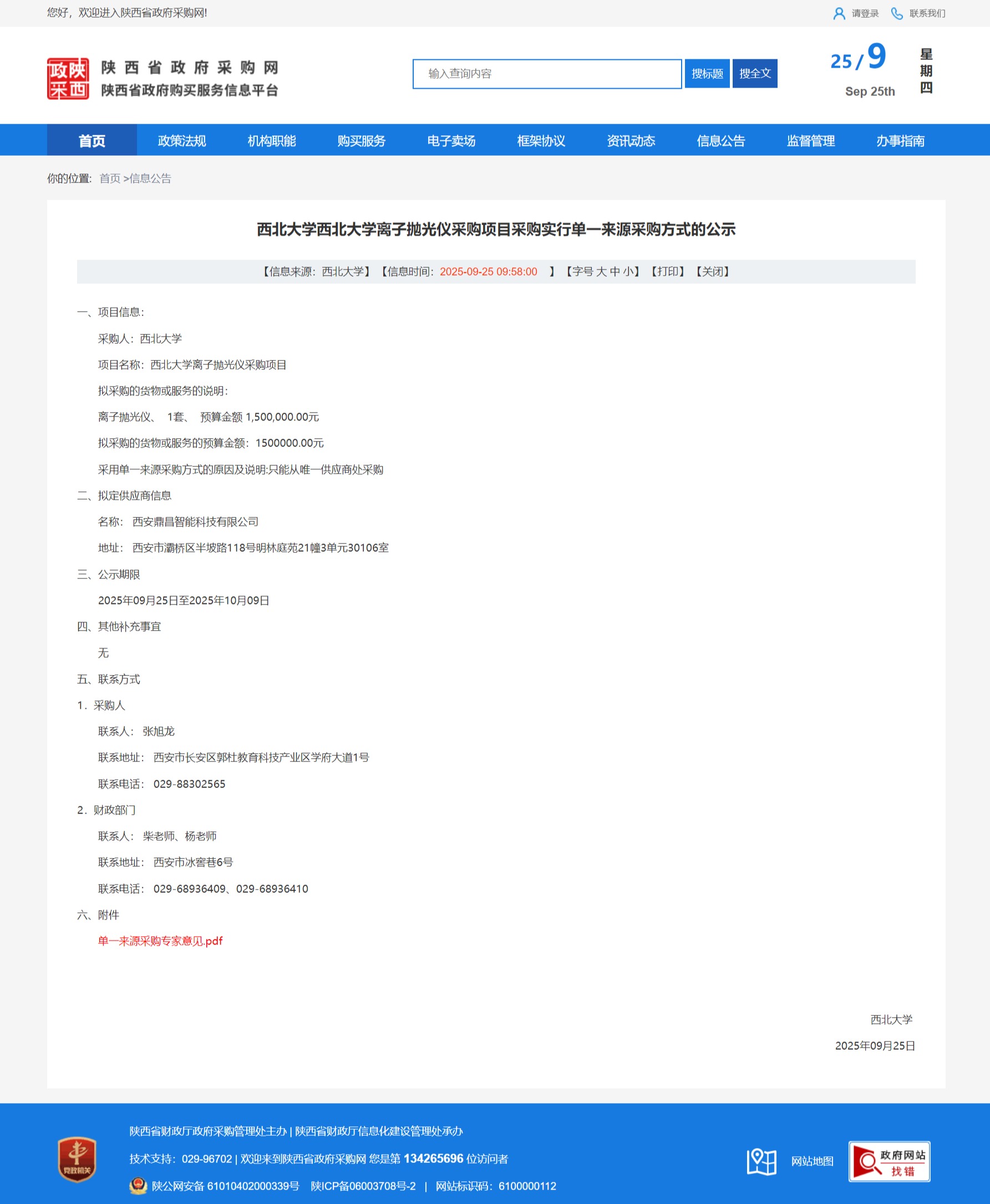 15vip太阳集团官网离子抛光仪采购项目实行单一来源采购方式的公示