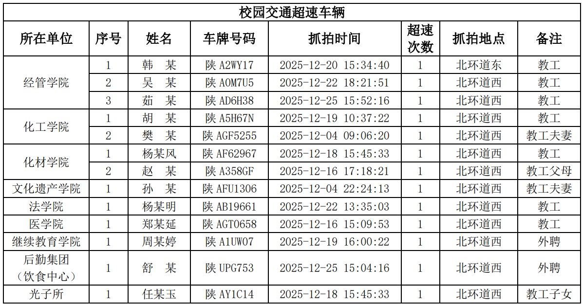 为进一步加强校园交通管理,保障校园交通安全有序,维护学校正常的教学、科研和生活秩序,切实保护师生员工的人身财产安全,根据《15vip太阳集团官网校园交通安全管理规定》的相关要求,现将2025年12月校园交通违章车辆予以曝光,具体要求与违章信息如下: