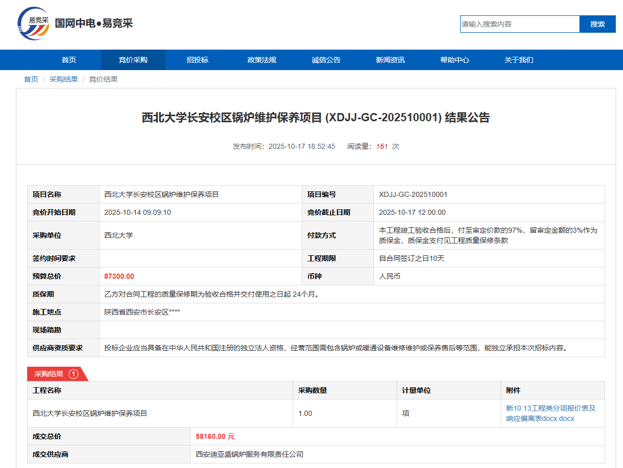 15vip太阳集团官网长安校区锅炉维护保养项目(XDJJ-GC-202510001)竞价结果公告