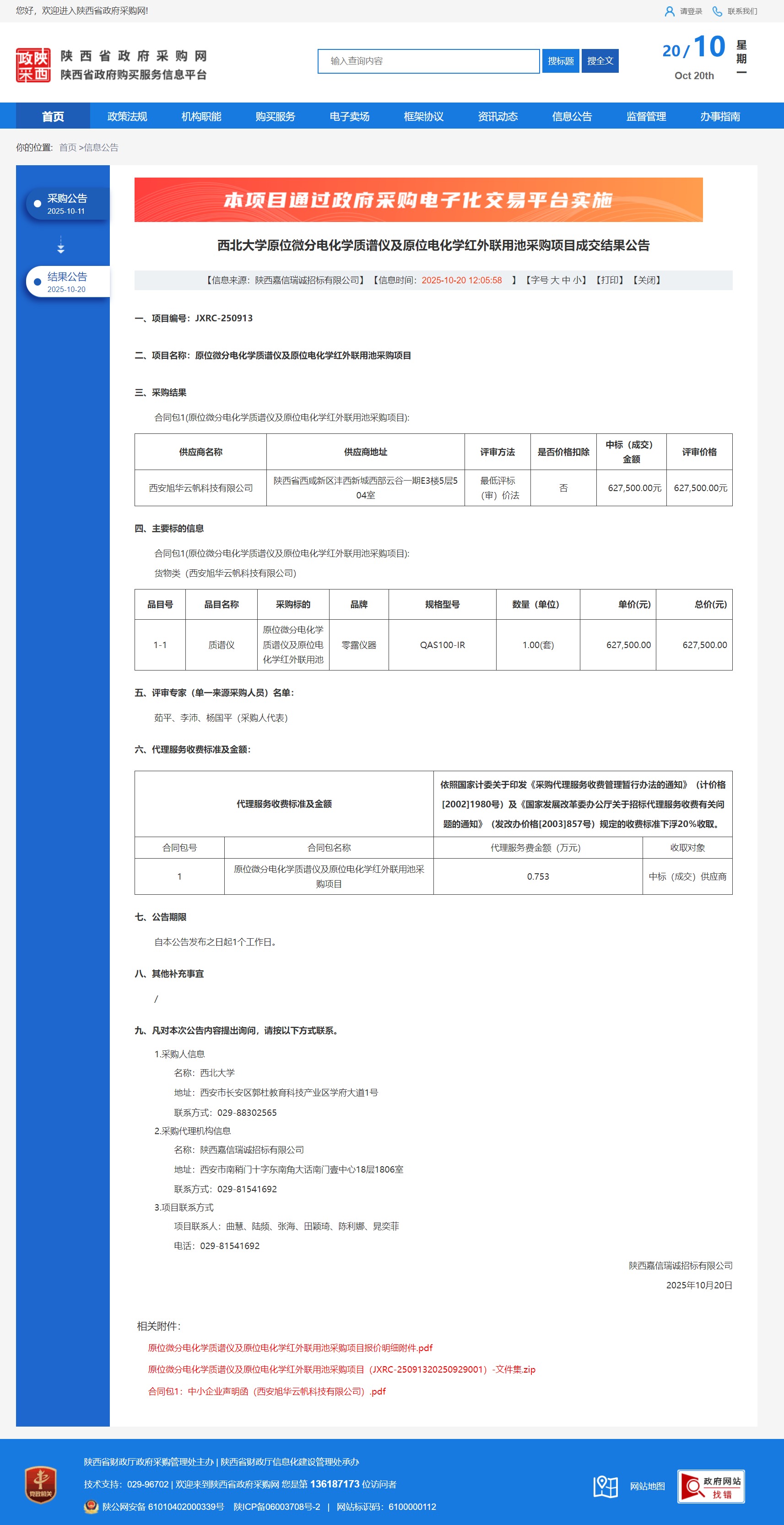 15vip太阳集团官网原位微分电化学质谱仪及原位电化学红外联用池采购项目成交结果公告