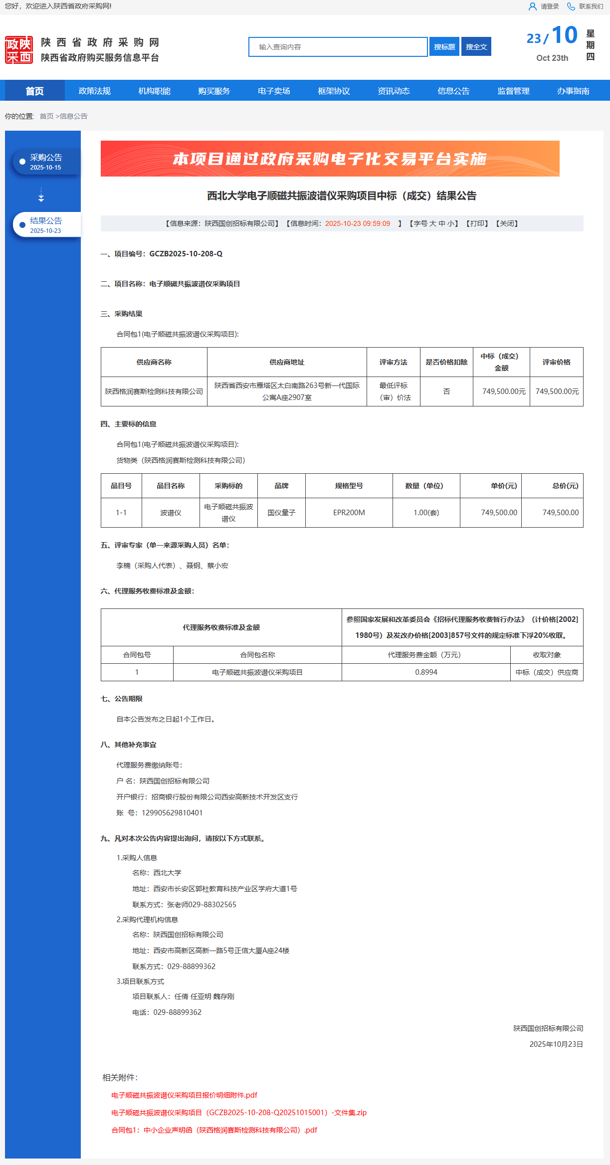 15vip太阳集团官网电子顺磁共振波谱仪采购项目中标(成交)结果公告