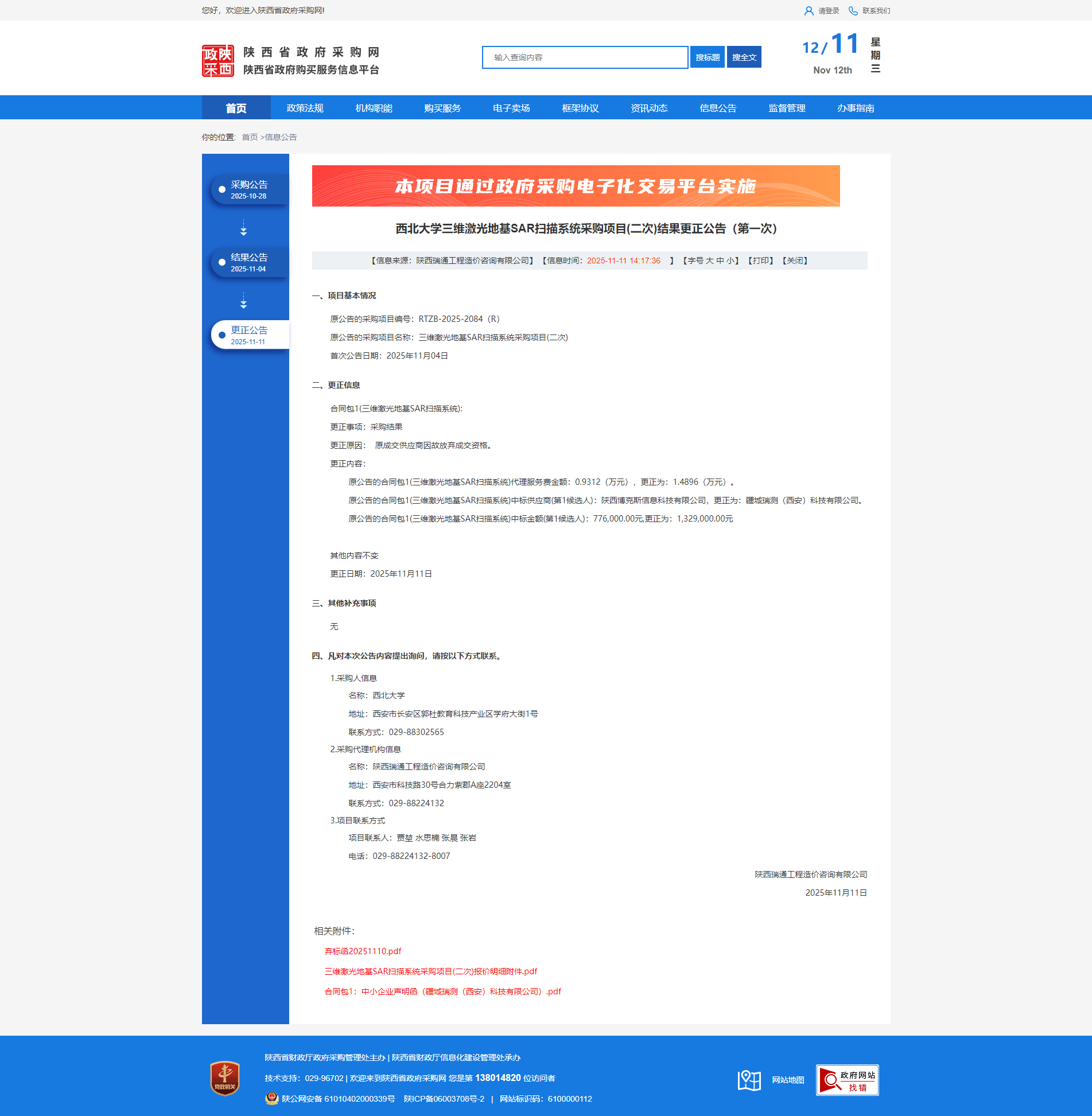 15vip太阳集团官网三维激光地基SAR扫描系统采购项目(二次)结果更正公告(第一次)