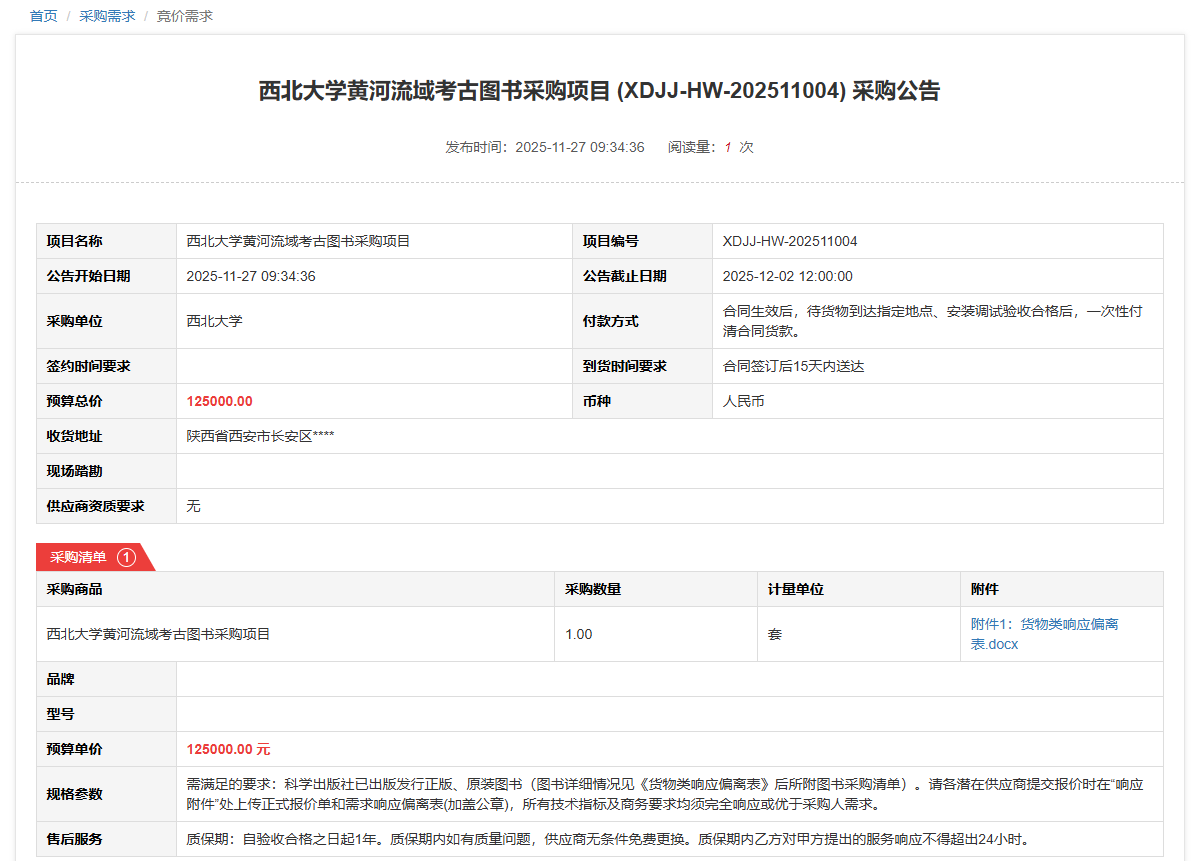 15vip太阳集团官网黄河流域考古图书采购项目(XDJJ-HW-202511004)竞价采购公告
