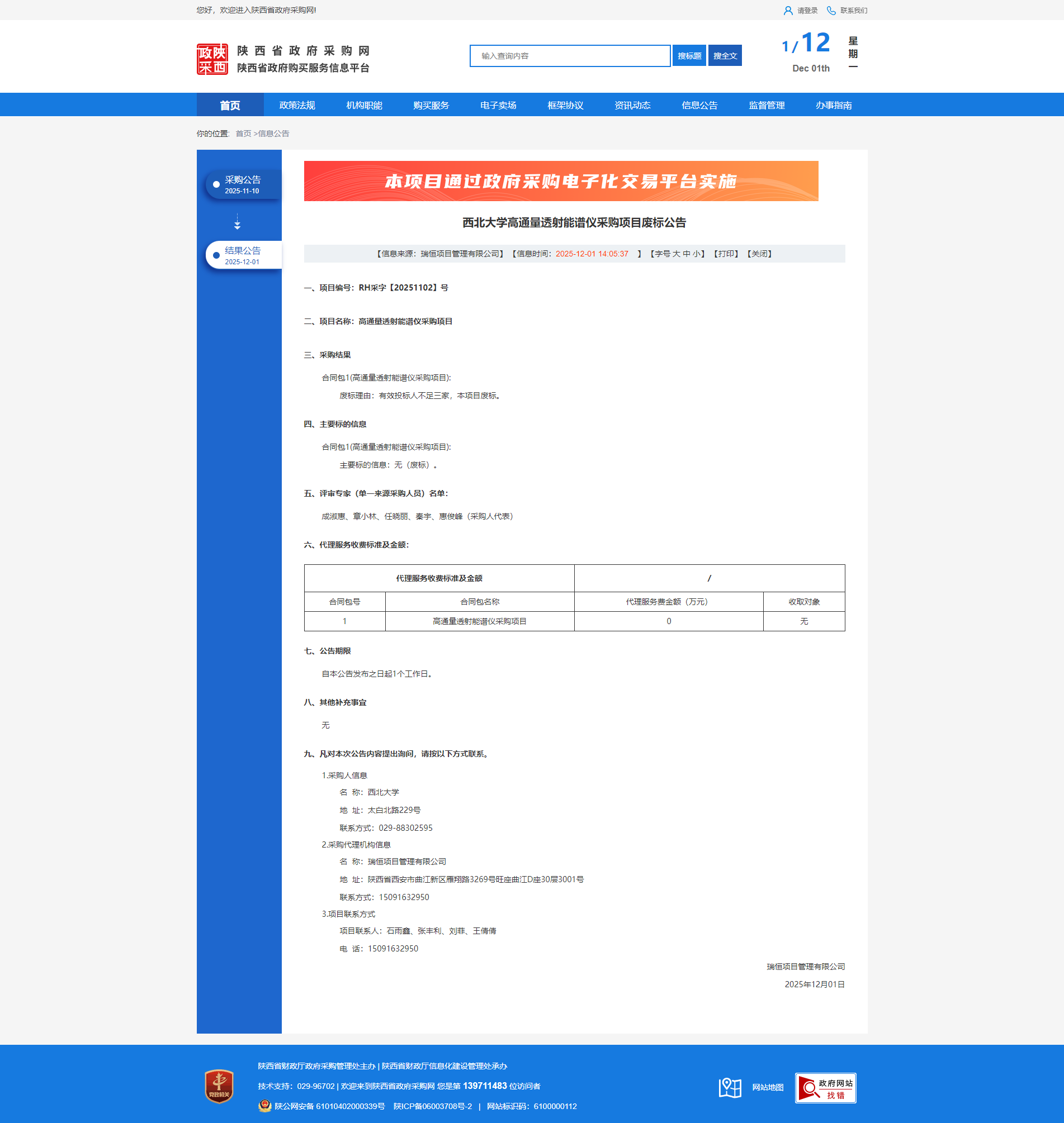 15vip太阳集团官网高通量透射能谱仪采购项目废标公告