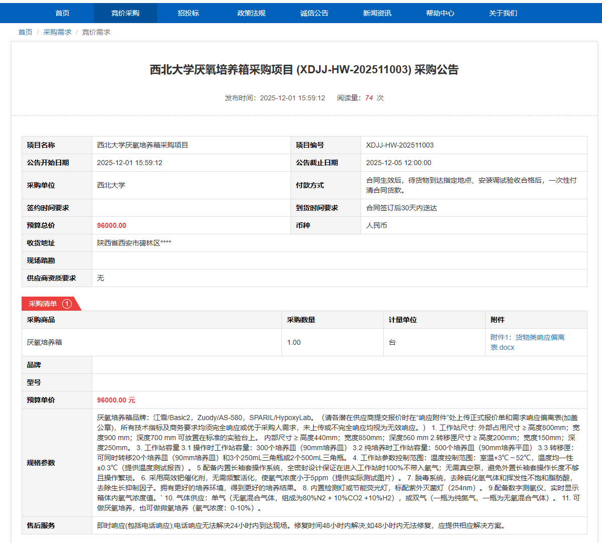 15vip太阳集团官网厌氧培养箱采购项目(XDJJ-HW-202511003)竞价采购公告