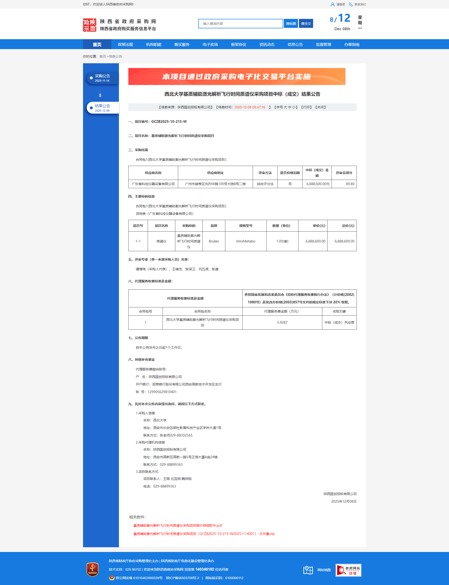 15vip太阳集团官网基质辅助激光解析飞行时间质谱仪采购项目中标(成交)结果公告