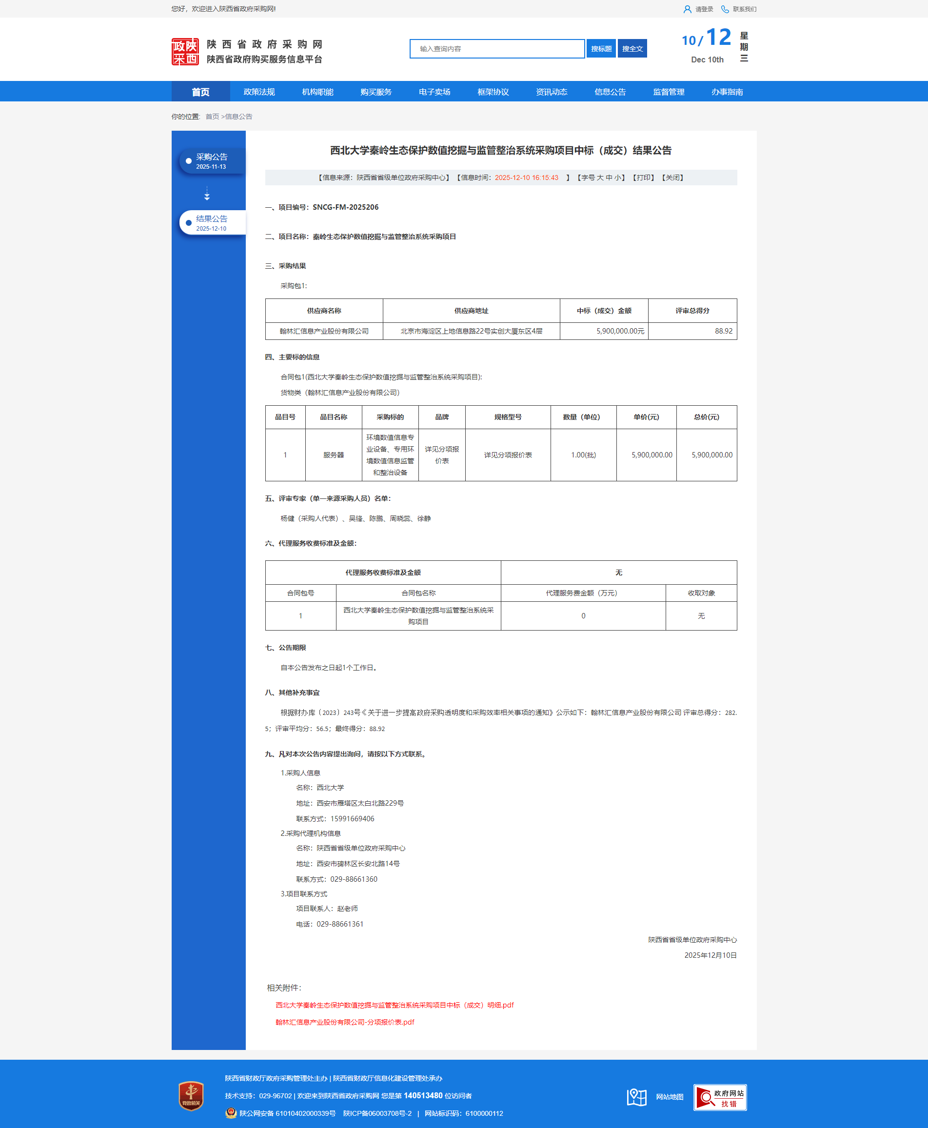 15vip太阳集团官网秦岭生态保护数值挖掘与监管整治系统采购项目中标(成交)结果公告