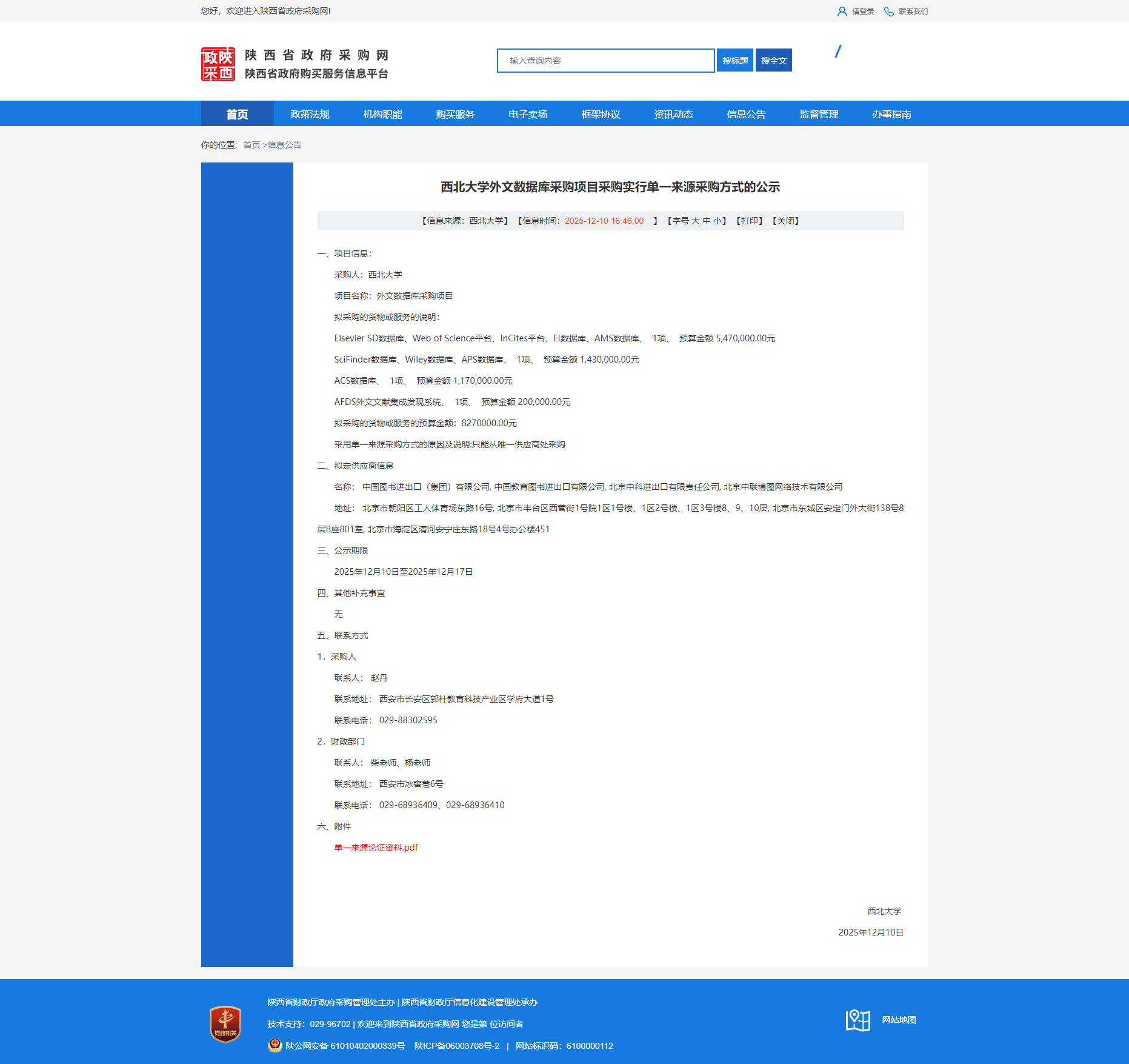 15vip太阳集团官网外文数据库采购项目采购实行单一来源采购方式的公示