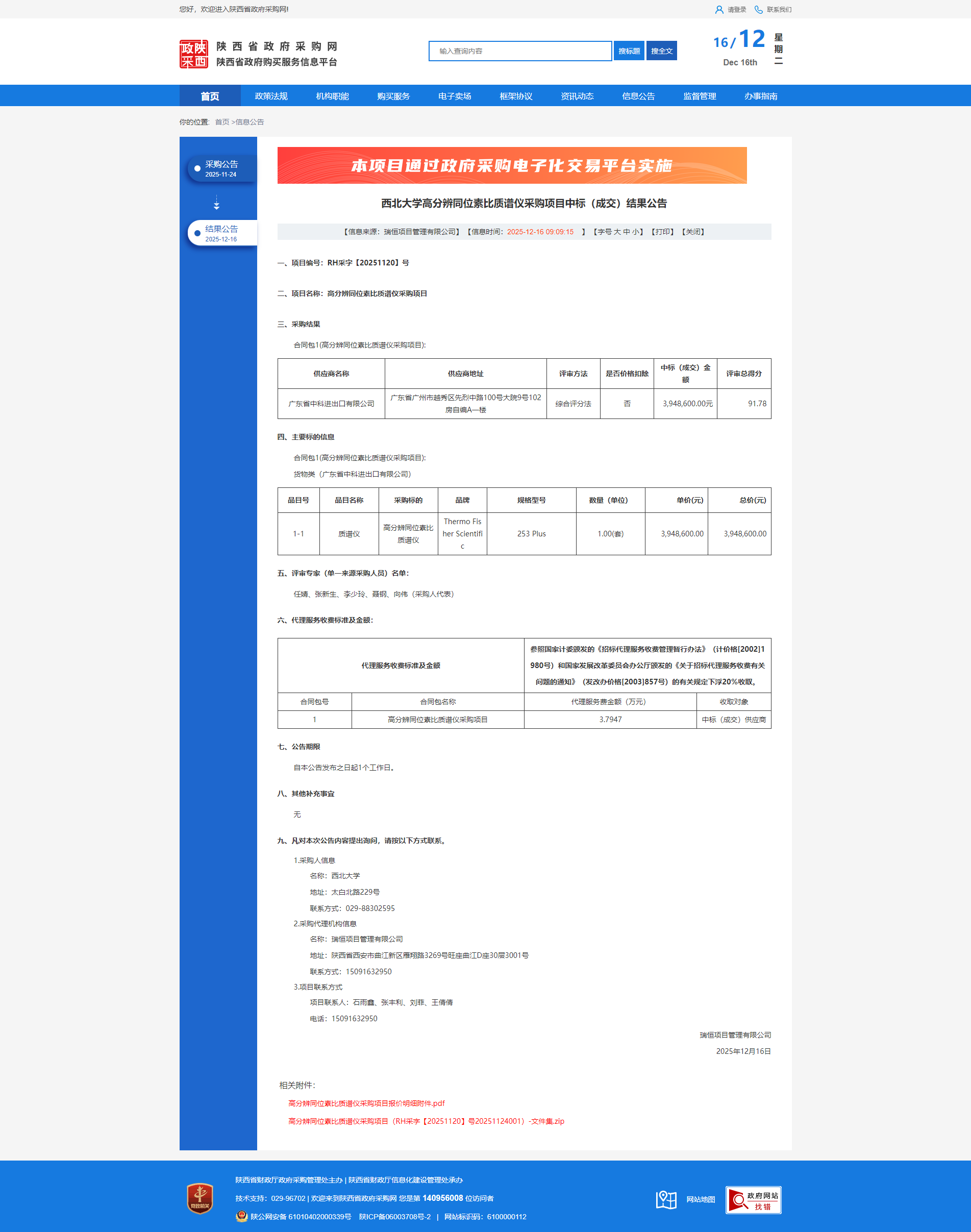 15vip太阳集团官网高分辨同位素比质谱仪采购项目中标(成交)结果公告