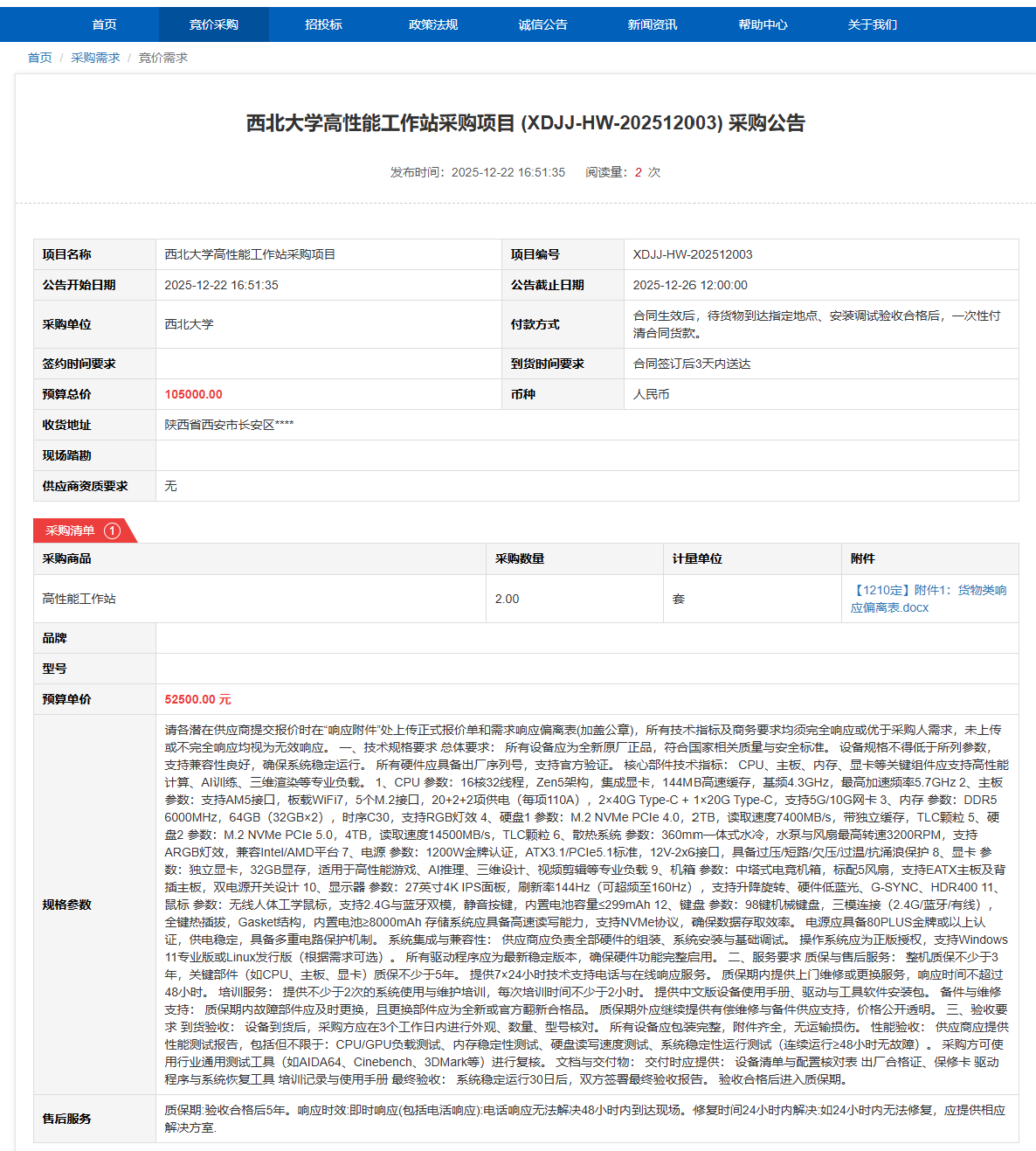 15vip太阳集团官网高性能工作站采购项目(XDJJ-HW-202512003)竞价采购公告