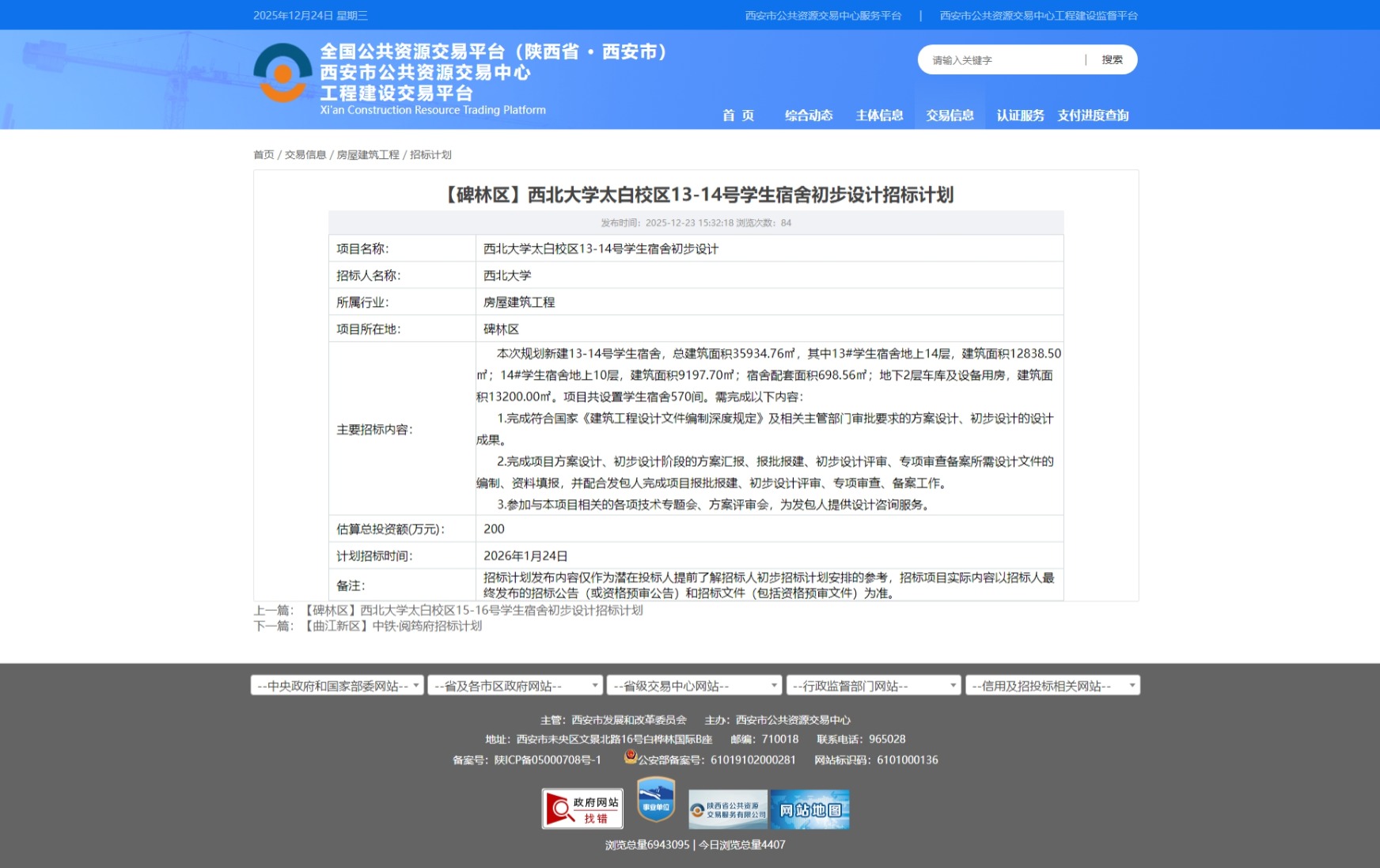 15vip太阳集团官网太白校区13-14号学生宿舍初步设计招标计划