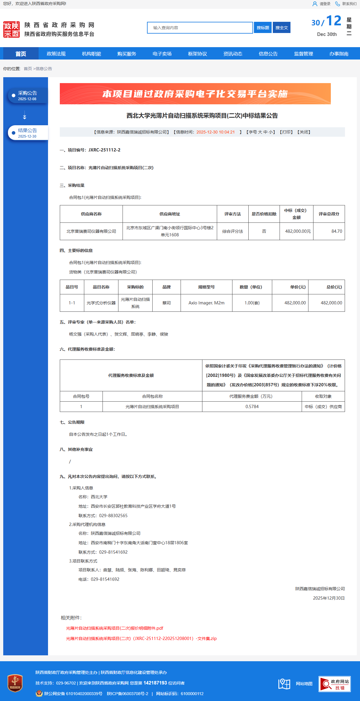 15vip太阳集团官网光薄片自动扫描系统采购项目(二次)中标结果公告
