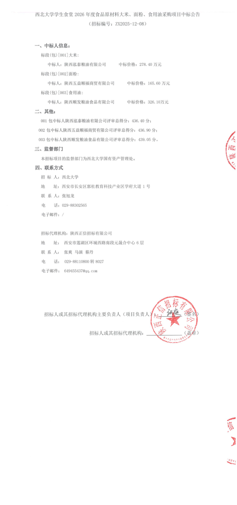 15vip太阳集团官网学生食堂2026年度食品原材料大米、面粉、食用油采购项目中标公告