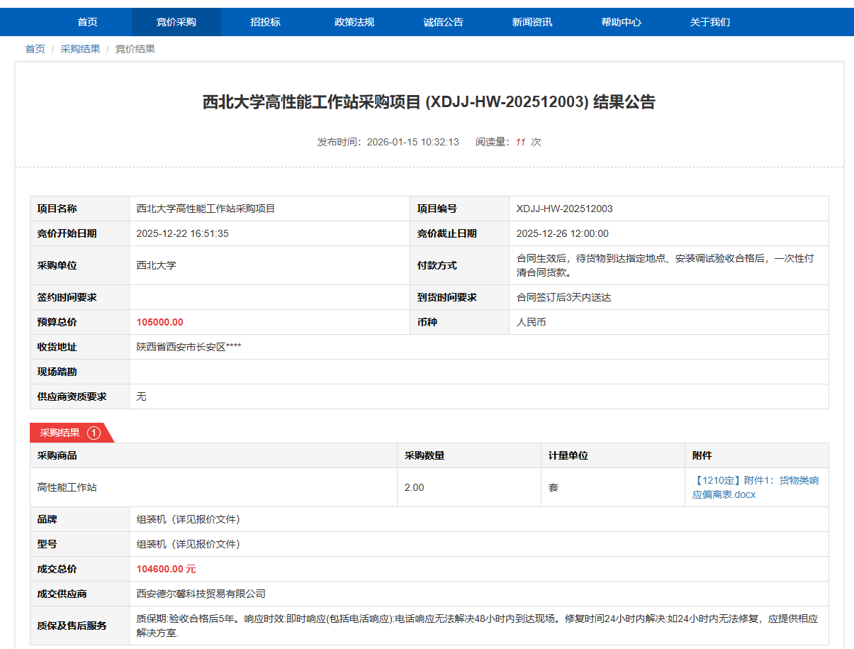 15vip太阳集团官网高性能工作站采购项目(XDJJ-HW-202512003)竞价结果公告